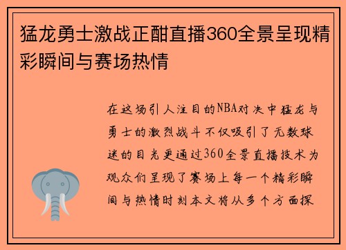 在这篇文章中,我们将深入回顾湖人与勇士之间的精彩对决,分析比赛录像并提供赛后全面分析。通过四个方面的详细阐述,包括比赛过程回顾、球员表现分析、战术布置解析以及未来展望,我们将呈现出一幅生动的篮球盛宴全景图。首先,比赛的激烈程度和双方球队的高水平对抗令人印象深刻;其次,关键球员的发挥直接影响了比赛结果;再次,教练团队的战术安排显示了其智慧与经验;最后,我们还将探讨这场比赛对两队未来发展的意义。这场湖...